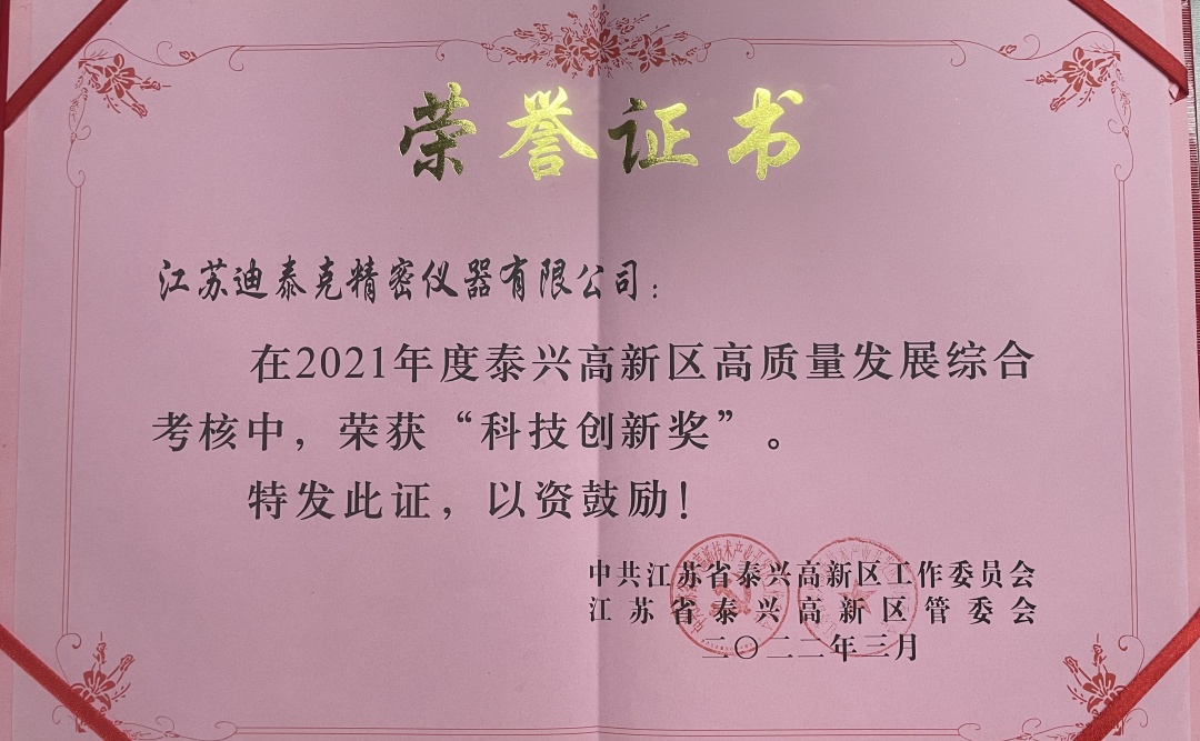 在2021年度泰興高新區(qū)高質(zhì)量發(fā)展綜合考核中,江蘇迪泰克精密儀器有限公司榮獲“科技創(chuàng)新獎”。